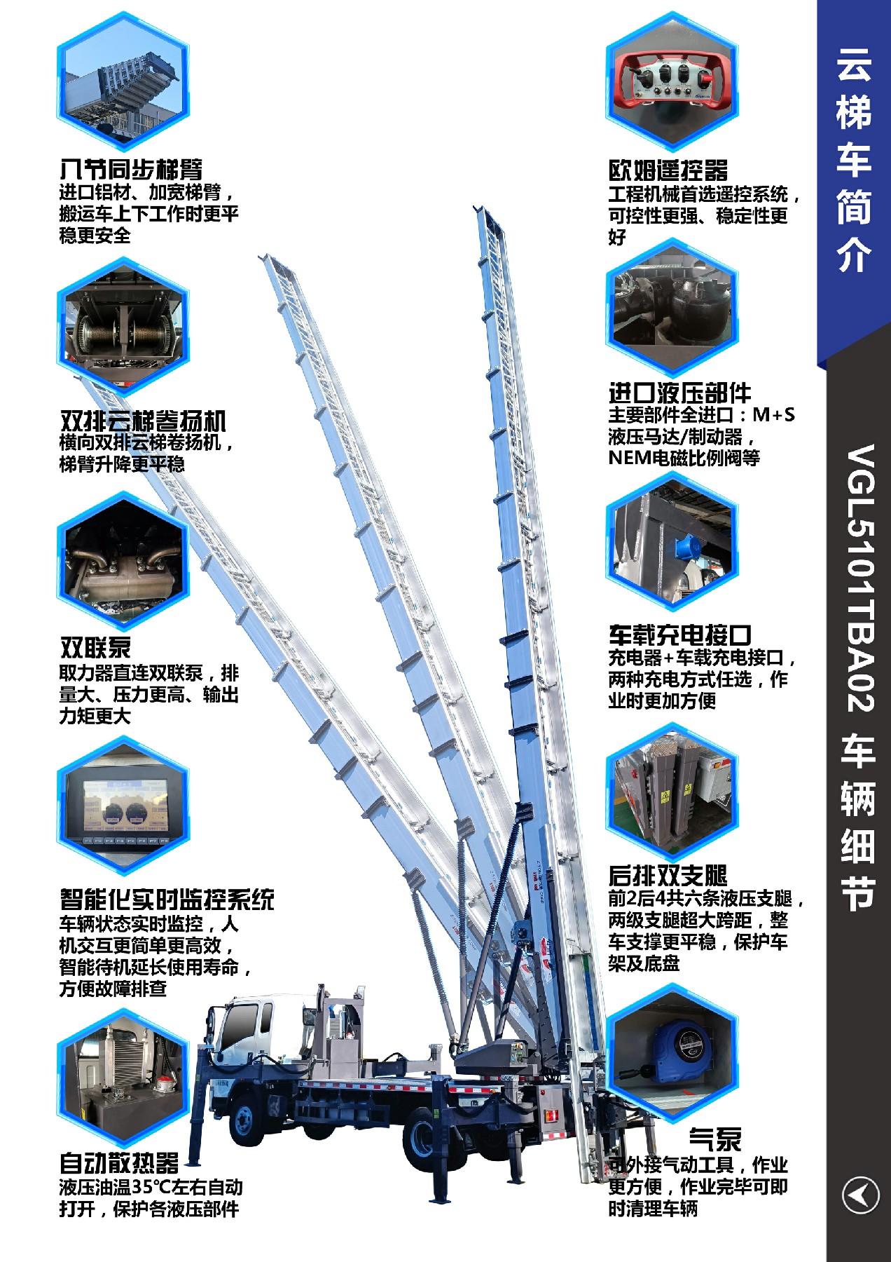 公司主营云梯车及高空作业车两个系列的多种车型,产品关键结构选用高强度材料、进口液压部件、先进的电气控制系统,引进国外先进的生产技术及工艺,重点开发智能化、自动化的云梯车及高空作业车。