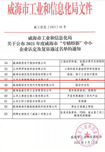 2021年9月,威海高丽亚专用汽车制造有限公司通过了威海市2021年“专精特新”中小企业认定。